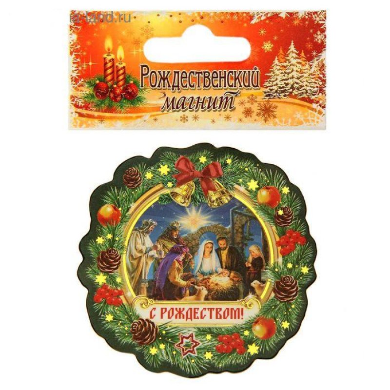 Магнит в форме рождественского венка с золотым тиснением станет приятным знаком внимания, который напомнит всем о светлом празднике.