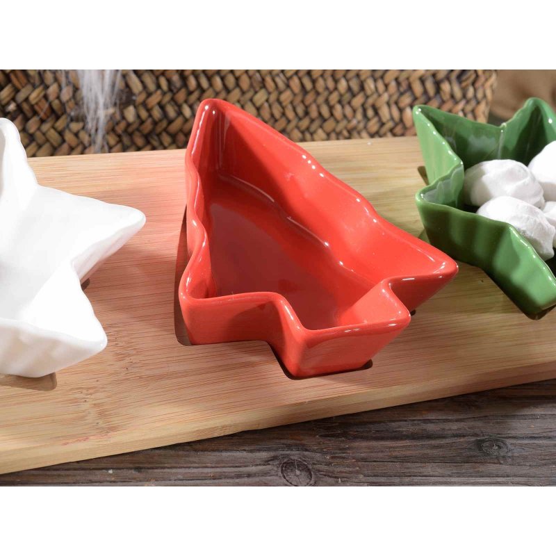 Set aperitivo a tema natalizio con tagliere in legno e 3 ciotole in ceramica colorata