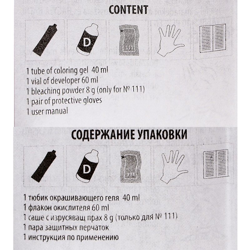 Ingredienti:Gel Colorante: Aqua, Ammonia, Acrylates/C10-30 Alkyl Acrylate Crosspolymer, Cocamidopropyl Betaine, Propylene Glycol, Pentasodium Pentetate, Erythorbic Acid, Silicone Quaternium-20, Thiolactic Acid, Disodium Cocamphodiacetate, Glycerin, Royal Jelly, P-Phenylendiamine, P-Aminophenol, Resorcinol, M-Aminophenol, 1-Naphtol. Los componentes pueden variar de un color a otro. Crema Oxigenada: Aqua, Hydrogen Peroxide, Ceteareth-7, Pentasodium Pentetate, Disodium Pyrophosphate, Sodium Stannate, Phosphoric Acid.