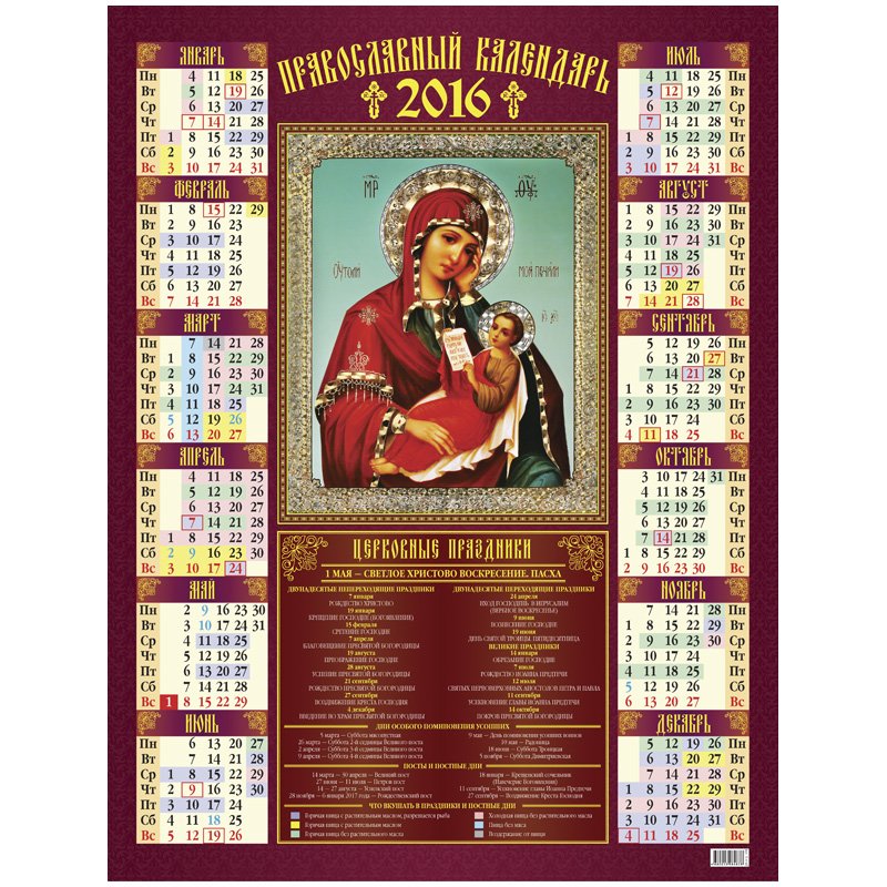 Календарь листовой настенный 2016г. "Икона Божией Матери" 45/60 см.