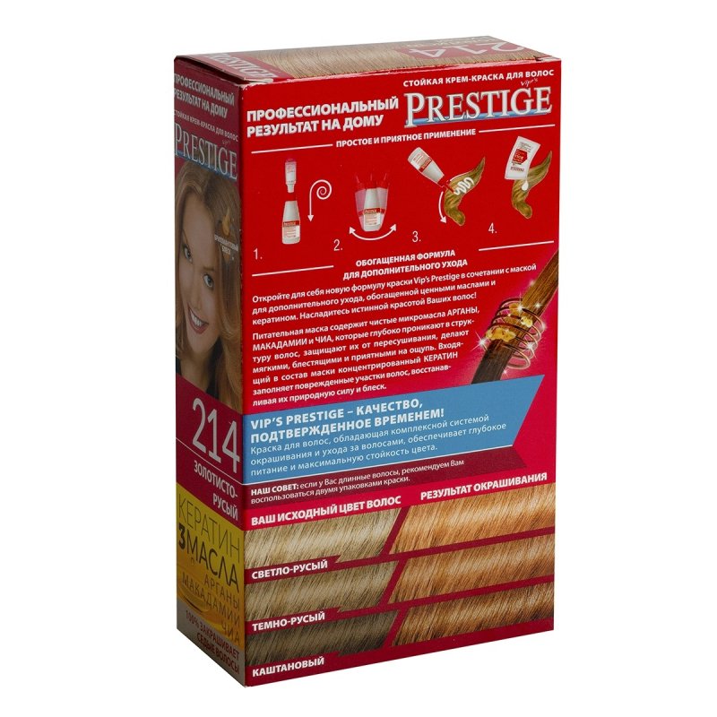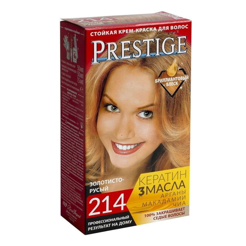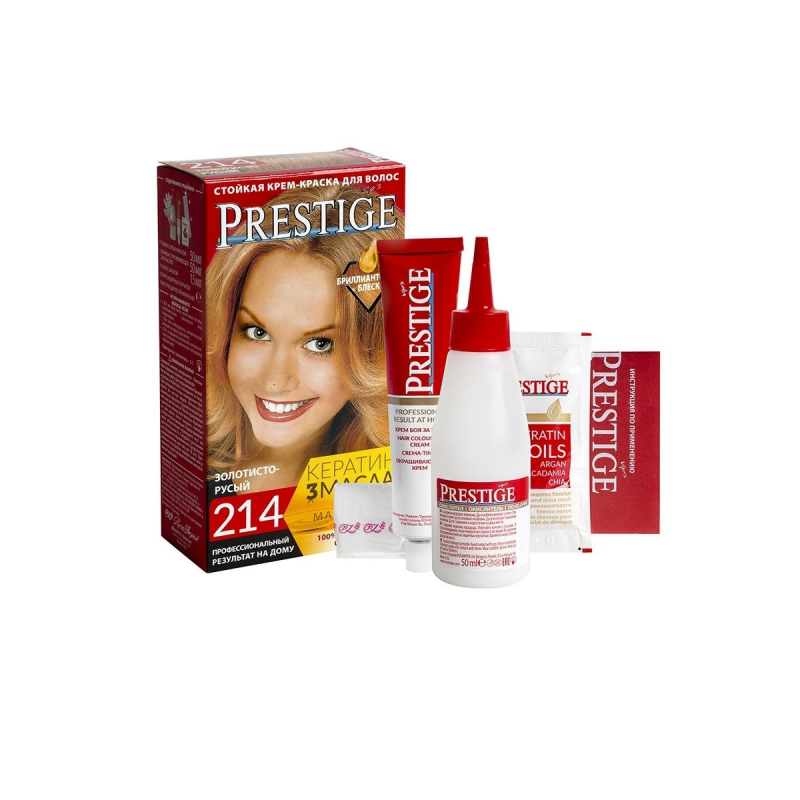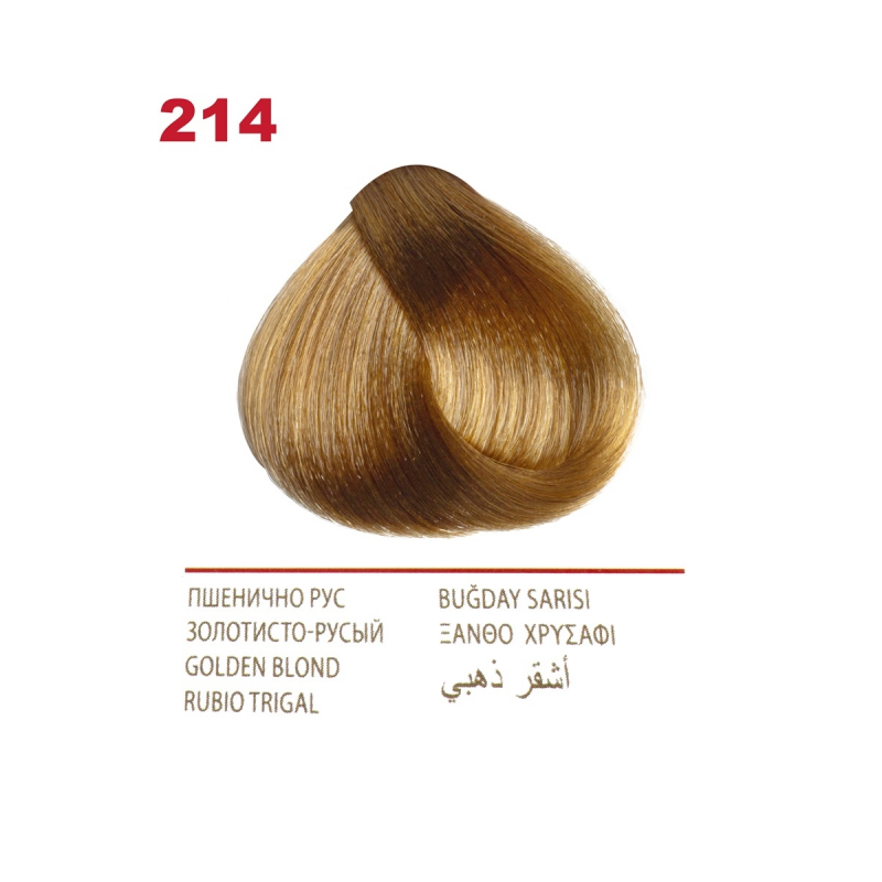 Crema Colorante per capelli, 214 Biondo dorato, con uno speciale complesso di proteine di grano, vitamina C e F. Contenuto della confezione: 1 tubetto di crema da 50 ml; 1 flacone ossidante da 50 ml; 1 sacchetto di balsamo per capelli tinti da 15 ml; 1 guanto da 1; Crema - Ossidante 1:1