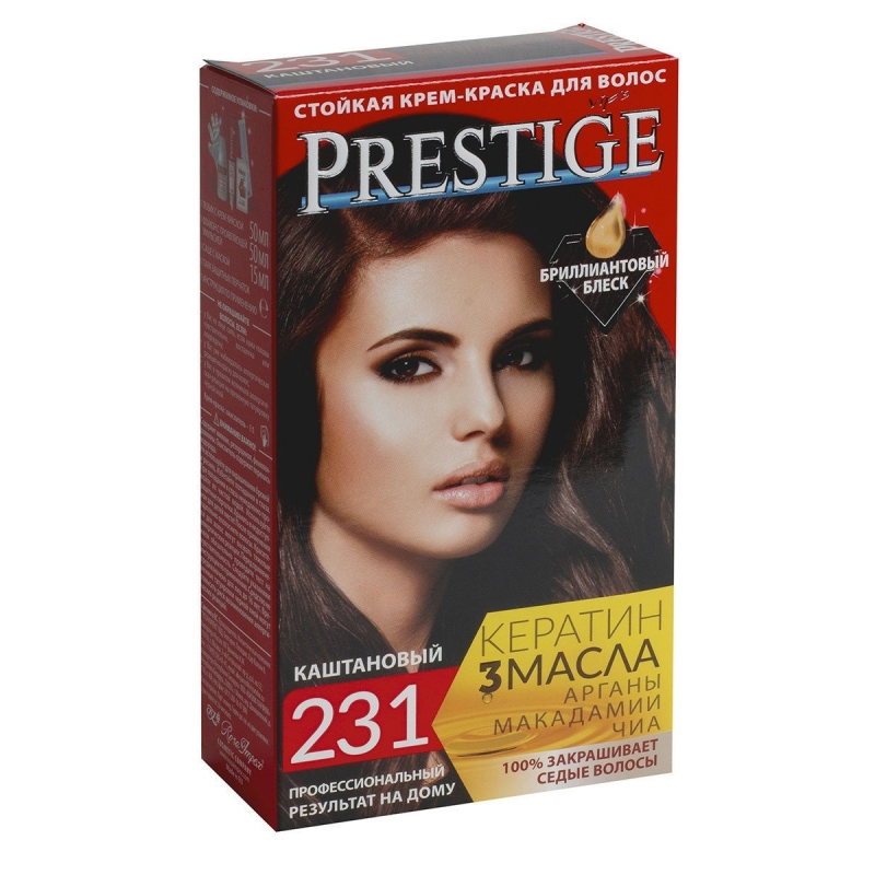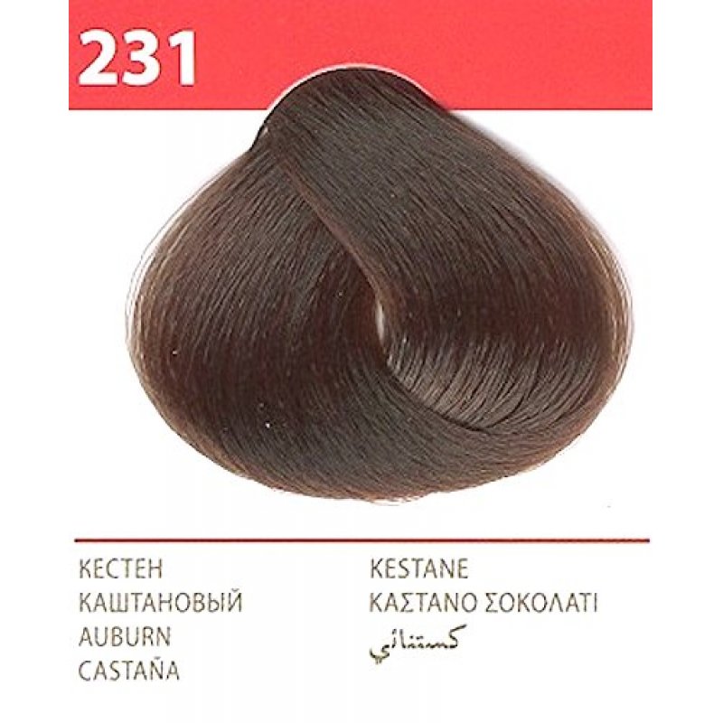 Crema Colorante per capelli, 231 Castano, con uno speciale complesso di proteine di grano, vitamina C e F. Contenuto della confezione: 1 tubetto di crema da 50 ml; 1 flacone ossidante da 50 ml; 1 sacchetto di balsamo per capelli tinti da 15 ml; 1 guanto da 1; Crema - Ossidante 1:1