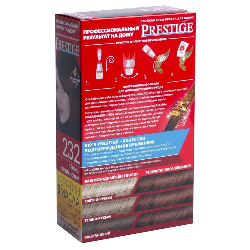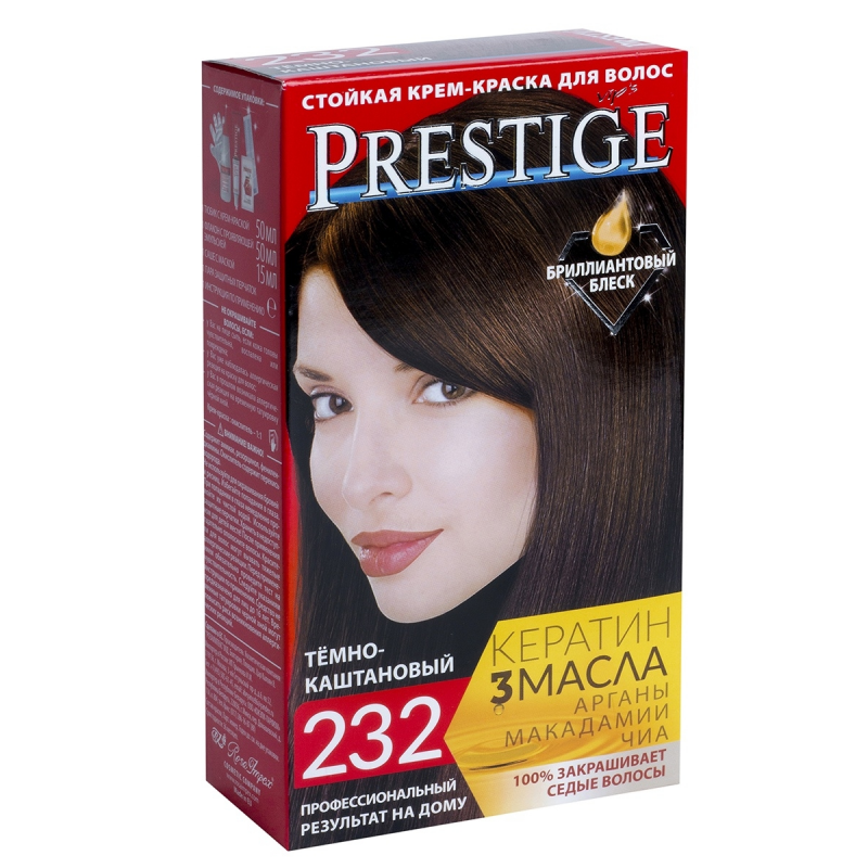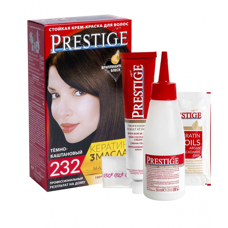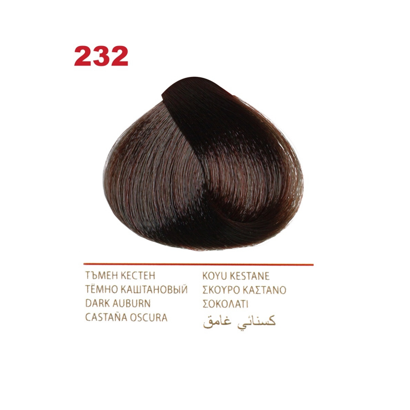 Crema Colorante per capelli, 232 Castano scuro, con uno speciale complesso di proteine di grano, vitamina C e F. Contenuto della confezione: 1 tubetto di crema da 50 ml; 1 flacone ossidante da 50 ml; 1 sacchetto di balsamo per capelli tinti da 15 ml; 1 guanto da 1; Crema - Ossidante 1:1