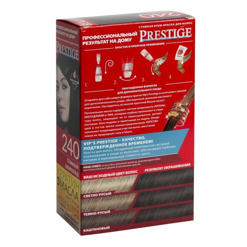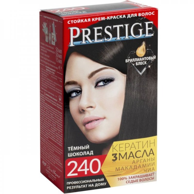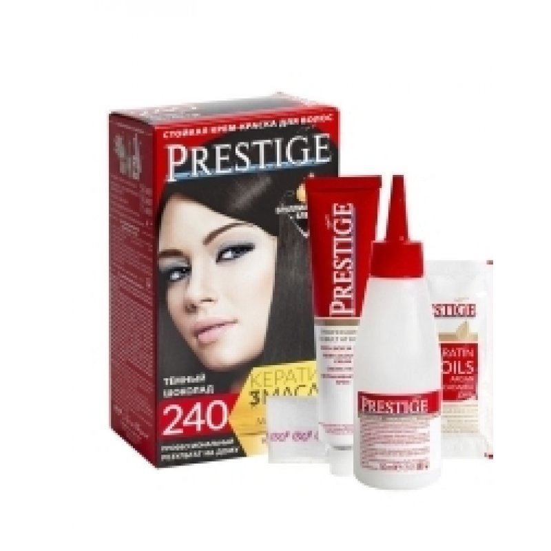 Crema Colorante per capelli, 240 Cioccolato fondente, con uno speciale complesso di proteine di grano, vitamina C e F. Contenuto della confezione: 1 tubetto di crema da 50 ml; 1 flacone ossidante da 50 ml; 1 sacchetto di balsamo per capelli tinti da 15 ml; 1 guanto da 1; Crema - Ossidante 1:1